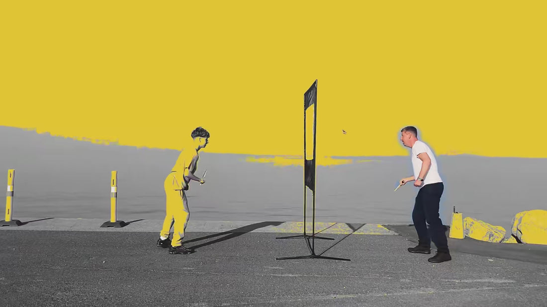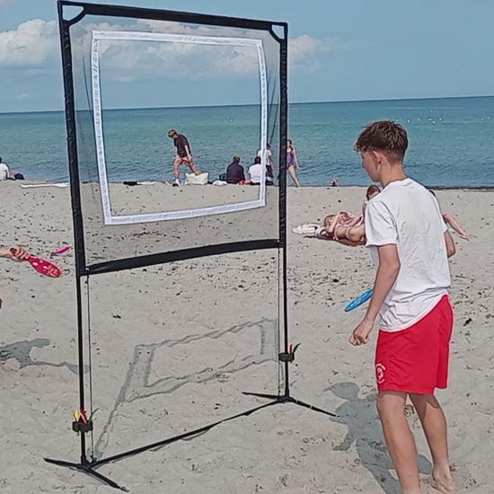 Start med to spillere og én af de tre bolde/fjerbolde som medfølger i alle spillesæt. Placér jer med cirka 1 meters afstand til nettet på hver side. Spil skiftevis gennem den hvide markererede åbning i nettet. Som i badminton og bordtennis, men her spilles igennem nettet.